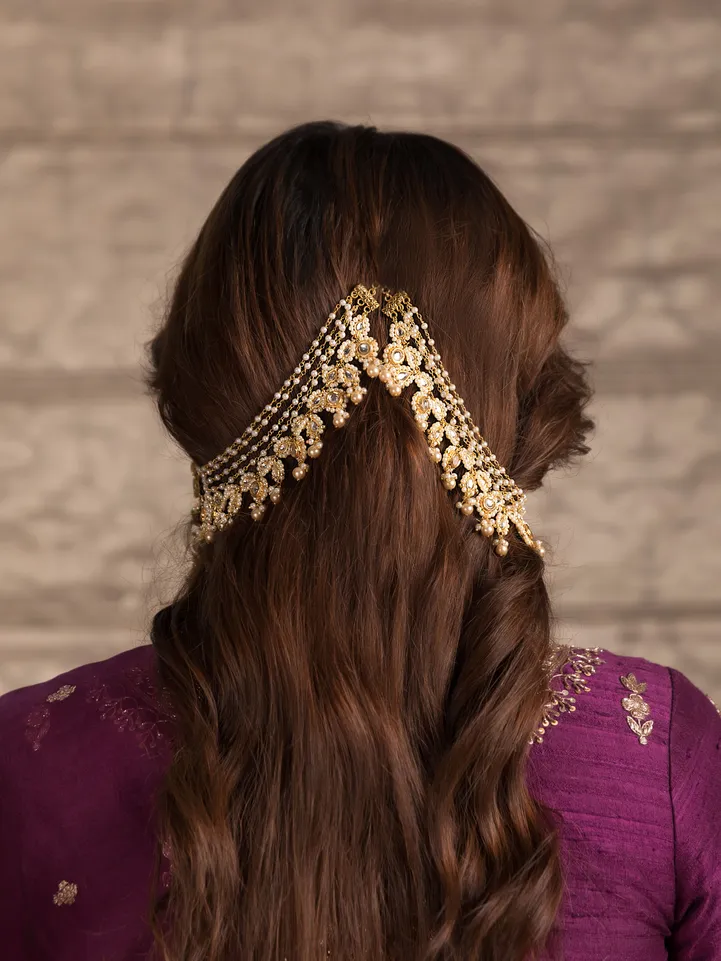 Introducing our exquisite Gold & White Biya Kundan Kaan Saharas, a perfect fusion of traditional and contemporary design. These unique earrings are designed to adorn your ears with grace and elegance, making a statement wherever you go.