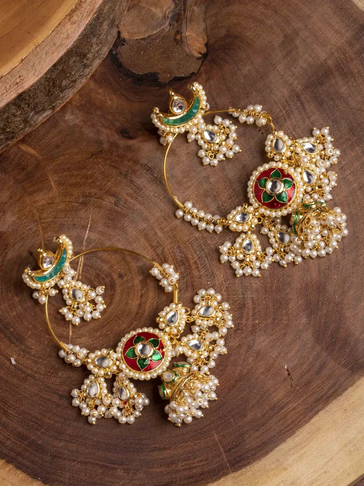 A celebration of pearls and intricate meenakari craftsmanship, this piece is handcrafted and is beautifully embellished with kundan work. Wear these and quirky twist to your outfit
