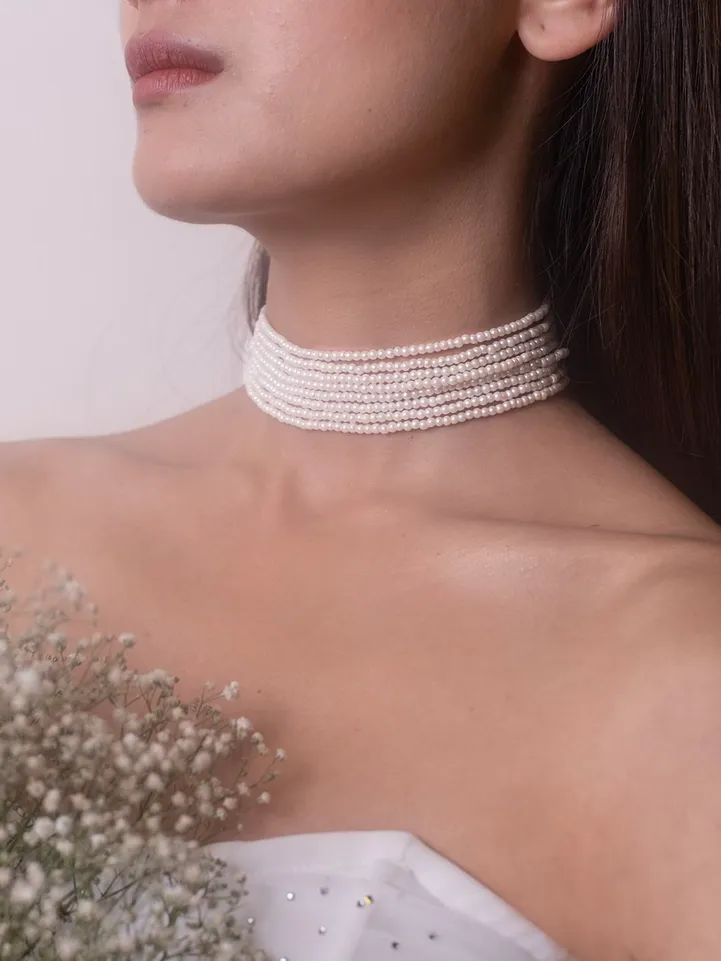 Adorn yourself with the timeless elegance of our Multi String White Pearls Choker Necklace. Meticulously crafted, this exquisite choker necklace features multiple strands of lustrous white pearls, exuding sophistication and grace.