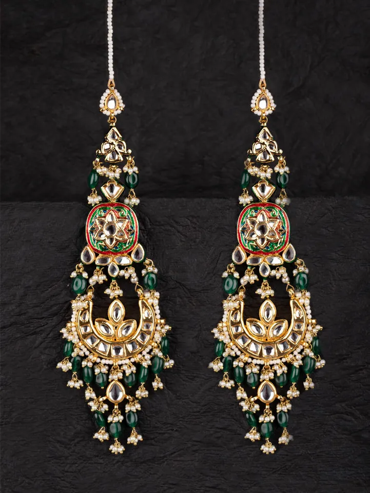 Embellished Chandbali earrings adorned with pearls and emerald drops to highlight you in the crowd. All products are handcrafted and made to order to ensure that you get exquisite workmanship with each piece you purchase. Please click on the whatsapp icon if you have any queries regarding the product/delivery timelines