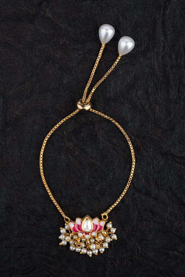 Our lotus peace bracelet is a fusion of all things good, traditional with touches of modern glam, you can stack it up or wear it by itself. Set on a Gold Finish chain, the lotus is the centrepiece of this bracelet decroated by a bunch of pearls.