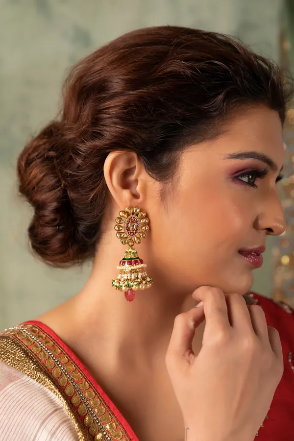 Designed to grace your ears with effortless elegance, these jhumkis effortlessly elevate any ensemble. Whether worn for weddings, cultural celebrations, or special occasions, their captivating beauty is sure to mesmerize hearts and turn heads, leaving a lasting impression of regal splendor.